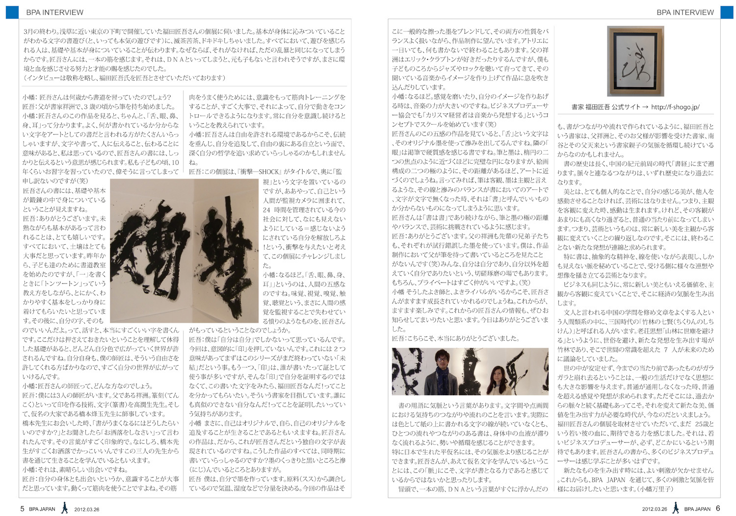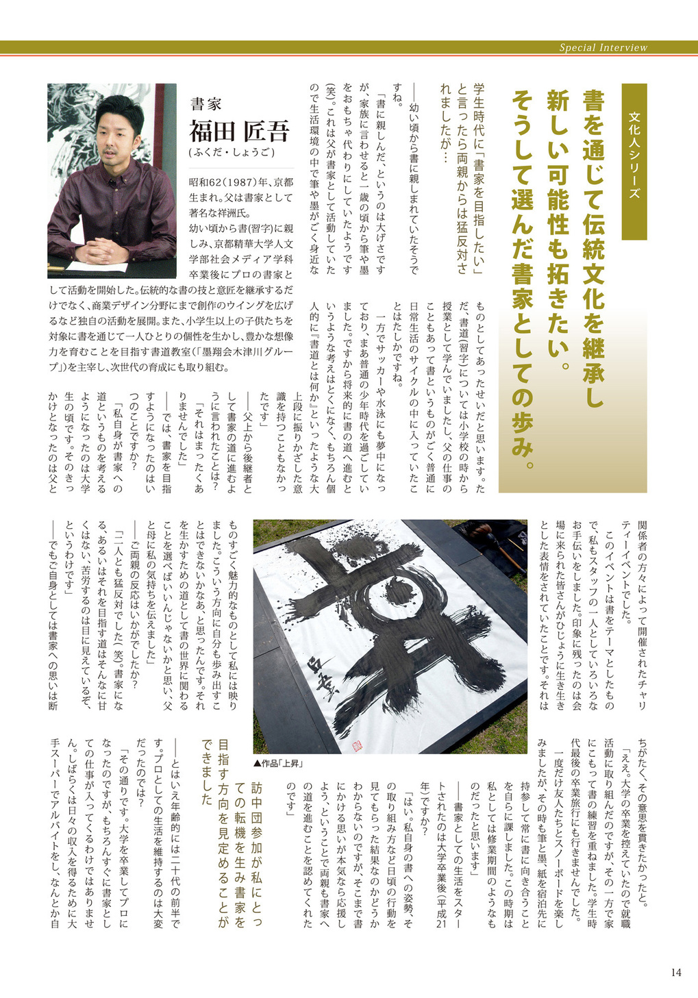 近年では、NHK国際放送/BS1にて放送の「Core Kyoto 書に生きる」に出演。その他、日本テレビのゴールデンタイム放送特番【ロンブー&チュートの芸能人ヒットソングで爆笑ショーバトル】で芸人の平成ノブシコブシに大字書道の指導/出演、TKO 木本武宏氏が司会の【ジャポニカTV】で特集回が放送されるなど様々なメディアにも登場。書デザインでNY・Paris・Milanoで開催された【 JAPAN TEXTILE COLLECTION 2014】にも参加。中国国際書法展一席準大賞受賞、巨大手漉き越前和紙とのコラボ大作、プロサッカーチーム 京都サンガF.C.とのコラボ活動や、真言宗 正壽院の寺号額・襖書「空空寂寂」・天井画「真」揮毫、ライブパフォーマンス、商業ロゴなど多岐に渡る活動を展開している。