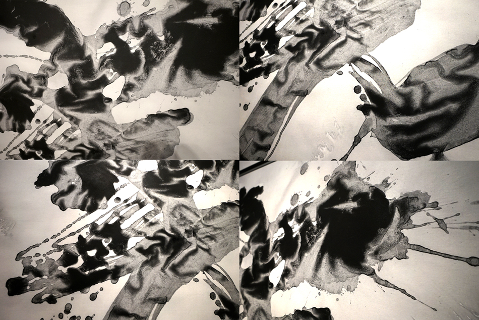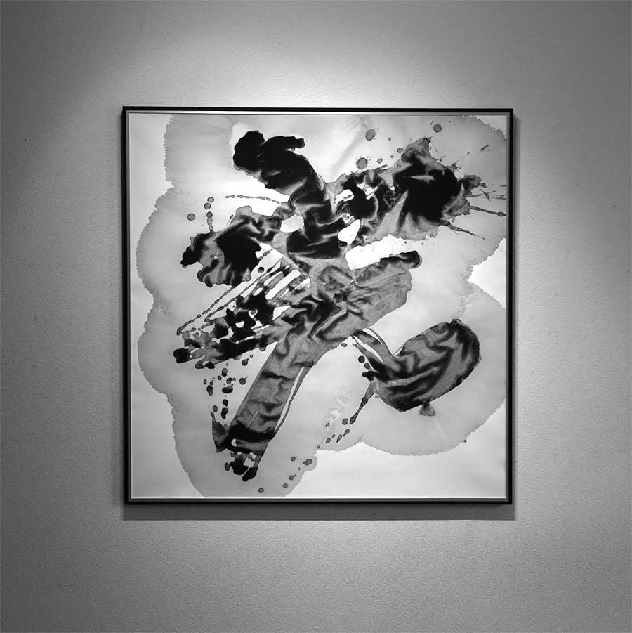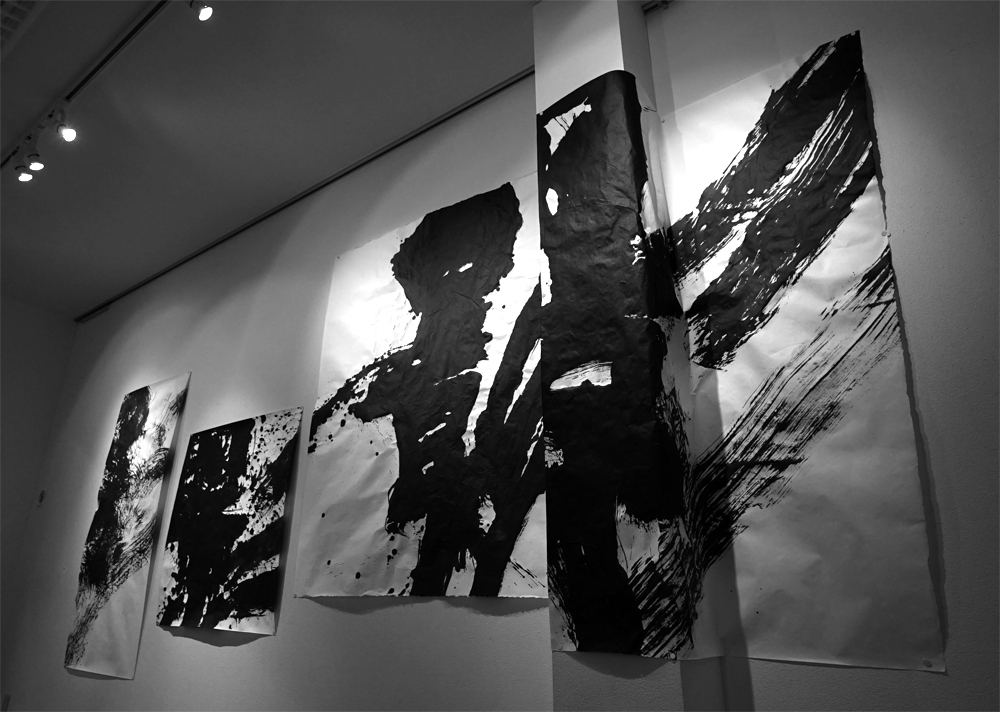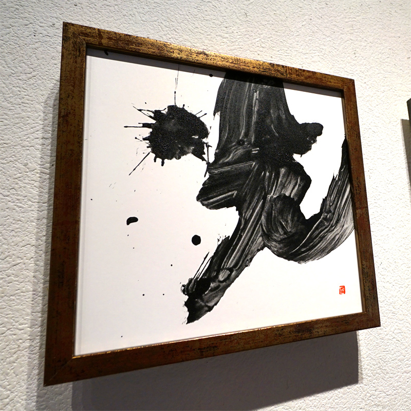 発表作は全て通常の白い紙(画仙紙・洋紙)に、自家製墨をつけた筆で一回のみ文字を書き、自然乾燥させた作品です。色の変化、滲みは『自家製墨』によるものになります。